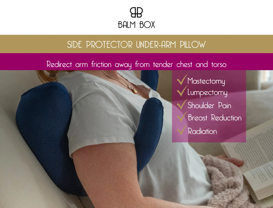 The weight of your arm can irritate breast cancer patient's chest area, especially after surgery and during radiation treatments. This clever pillow is specially designed to fit under the arm to redirect your body weight away from aching body parts, especially in the chest area. Consider purchasing two if undergoing a double-mastectomy.