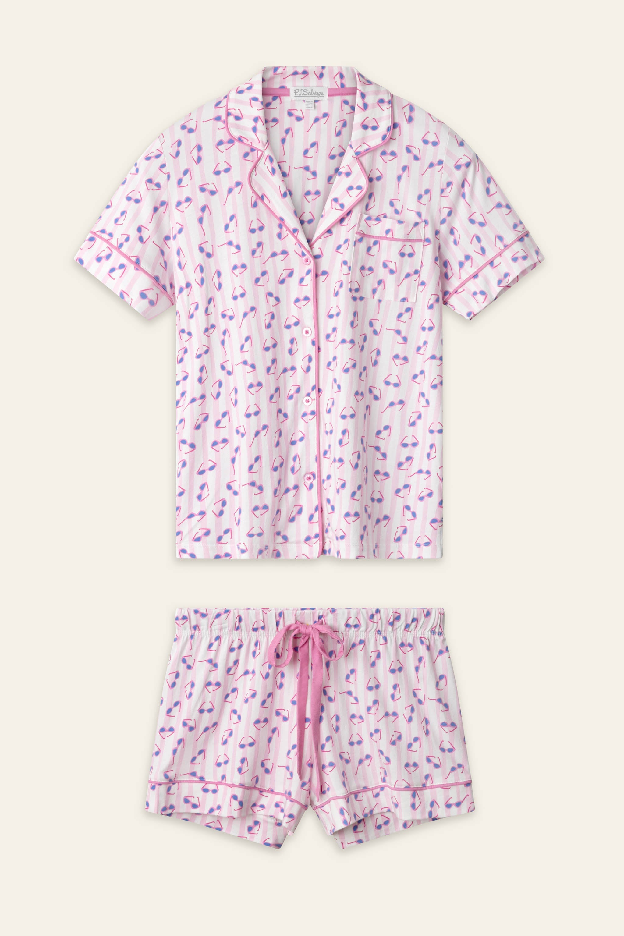 Shades on, worries off. This short pajama set features a playful sunglasses print scattered across a soft pink striped backdrop. The short-sleeve button-front top is finished with contrast piping and a chest pocket, paired with matching shorts featuring piping and an elastic waistband with an adjustable drawstring for easy lounging, slow weekends, and cozy nights.